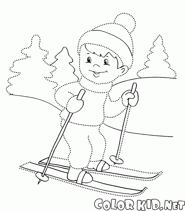填色画 - 在樹林裡的男孩滑雪